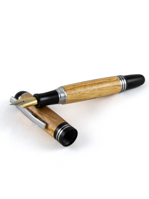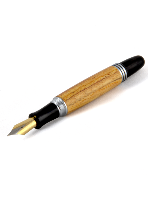 Crafted from golden Canary wood with rich grain patterns and finished with sleek chrome accents, this fountain pen feels both substantial and smooth in hand. The gently tapered barrel and rounded ends nod to timeless design, while the contrasting black grip and cap ends add a touch of modern edge.